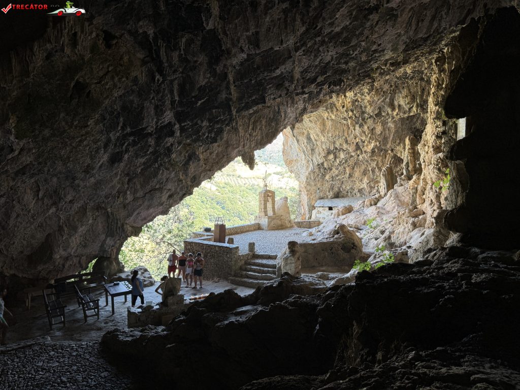 Intrarea are o deschidere mare — circa 25 m lățime și până la 20 m înălțime —, iar interiorul se deschide într-o cupolă naturală de aproximativ 70 m în diametru, cu stalactite și stalagmite impresionante, unele atingând 5–6 metri înălțime. Pe marginea intrării se află o mică bisericuță dedicată Agia Sofia (Înțelepciunii lui Dumnezeu), construită direct în stâncă.